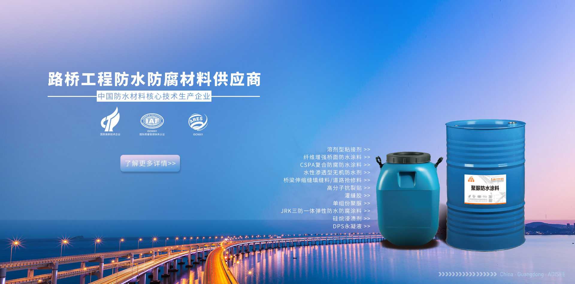 廣東愛迪斯新型材料科技有限公司廣州分公司 隔音隔熱系列 路橋及防腐防水系列 家裝工程防水系列 修繕補(bǔ)漏防水系列專業(yè)承接路橋防水防腐工程施工及防水材料銷售,路橋防水工程遍布全國各地,多年的技術(shù)經(jīng)驗(yàn)積累了一整套橋面防水病害處理方案,專業(yè)的路橋防水技術(shù),配套路橋防水施工設(shè)備,圓滿完成路橋防水施工任務(wù),用戶滿意度評價(jià)高,處橋梁防水行業(yè)技術(shù)領(lǐng)先水...